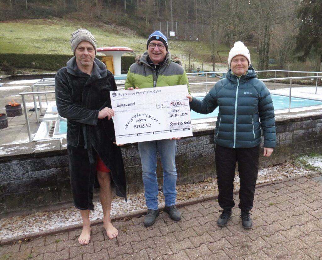 Im Rahmen der Veranstaltung „Eisbaden im Nachtwächterbad“ durften wir eine großzügige Spende in Höhe von 1.000 € von der SonoSys GmbH aus Neuenbürg entgegennehmen.